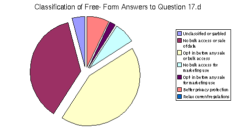 The free-form part of the question was answered on 99 out of the 303 questionnaires whose free-form responses were investigated by the task force's members. Of these responses, 2 could not be easily classified, and 2 more responses were garbled. Of those which could be classified according to the baskets listed above, 37 ended up in the "no bulk access or sale" basket, and another 43 were classified as "opt-in before any sale or bulk access". 7 respondents more specifically suggested no bulk access for marketing, and 2 respondents were categorized as "opt-in before marketing use". 9 respondents asked for improved opt-out, 7 generally asked for better privacy protection, and a no respondent suggested to relax the current restrictions.8